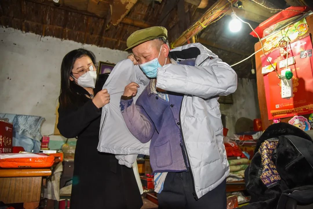 图|中环爱心大使帮助丁爷爷换上新买的羽绒袄