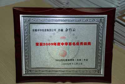 此次大会中,中环投资集团董事长余竹云先生荣获“2009年度中华百名优秀徽商”称号。此奖项是为了表彰今年以来,各地徽商在当地党委和政府领导下,认真贯彻落实中央关于进一步扩大内需、保持国民经济平稳较快增长的措施,努力应对国际金融危机的冲击,出现了积极变化,取得了好的成绩。