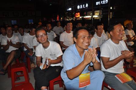 场上风趣的情景剧引得台下农民工兄弟热烈的掌声