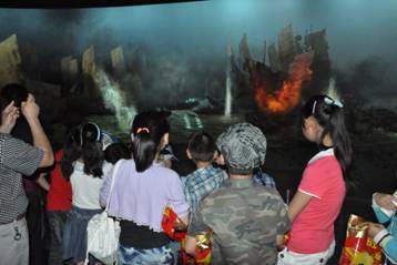 参观的高潮环节是一段现场模拟当年渡江战役的3D影像,画面上的飞机、大炮、机枪、帆船和背景音效的枪声,生动地再现当时渡江气势磅礴的画面,触动了现场每一位小童子军。