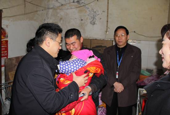 总裁助理黄少铭到阚振汉家慰问,亲切地抱过其刚出生的孩子逗乐