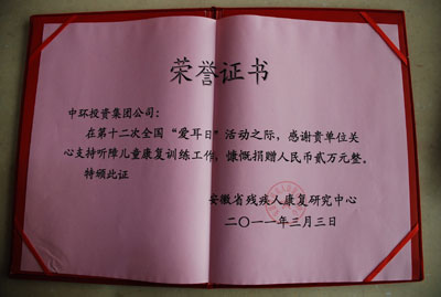 2011年3月中环投资集团为听障儿童康复训练捐赠两万元
