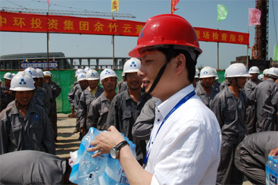 余竹云总经理看着建筑工人们顶着烈日热火朝天的工作,也走进施工现场,并亲手将一瓶瓶矿泉水送到工人师傅的手中。工友们都非常感动,纷纷表示一定不辜负中环公司的关怀与业主的期待,保证按质按时完成施工任务。