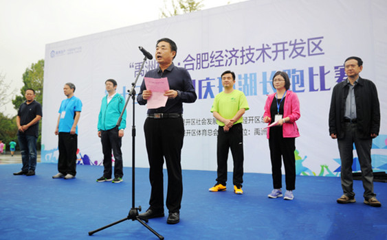 本次比赛以“全民健身、健康经开”为口号,由区社会发展局、区总工会主办。上午8:30,开幕式在蒙蒙细雨中如约举行!合肥市体育局局长菅青;区工委副书记、管委会副主任桑林兵;工委委员、社会发展局局长李应天等领导出席了活动现场。随后,在主持人的介绍下,经开区第十三届迎国庆环湖长跑比赛正式拉开帷幕!