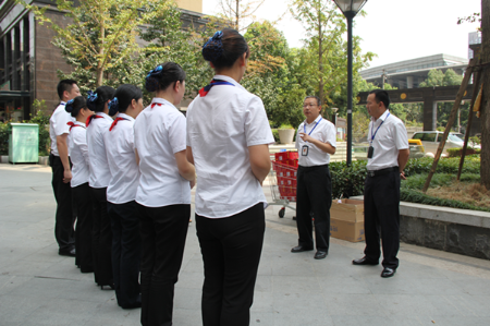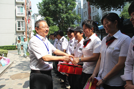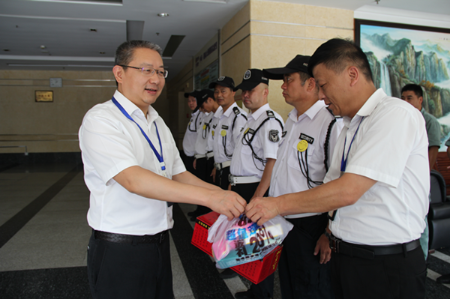执行总裁乔晓戈为国际大厦物业管理处员工发放防暑降温用品