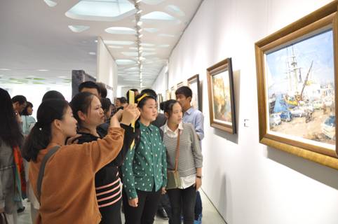开幕式结束后,嘉宾们纷纷参观了本次画展。徜徉作品间,体会到艺术家在攀登艺术高峰中不懈的努力,每一幅作品都凝聚了心血。画面充满着巫俊先生对现实生活体验的热情,感受来自他内心深处的蜕变。从《跨越》到《变迁》,从《三峡大坝工地》到《大编组站》,一幅接一幅体现时代气息的鸿篇巨制横亘在观众面前,激情饱满,气势恢宏,展示出前所未有的视觉冲击和震撼力。在《黑白徽州》和《茅盾的故乡—乌镇》等表现江南古镇的风景画中,在这些纷乱的笔触中,突显了画家内心一份沉重和激越情怀。在《巴黎圣母院》中的沉厚的调性中,感受到那苍白的墙面,冷灰的房顶和暖灰的天空所构成的节奏感,犹如一曲低沉的交响乐章……在激越和厚重的笔触和肌理中看到了画家本真的性情。