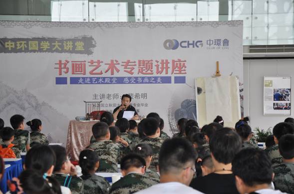 军旅文化体验结束后,下午13:30,孩子们来到中环艺术馆,参加本届中环国学大讲堂,聆听艺术名家裴希明老师书画艺术专题讲座。除了现场书法、现场绘画、现场演示观摩等,裴希明老师为童子军娓娓讲述了中国传统书画艺术起源,传授中国书法与绘画基本技法,教大家如何鉴赏书画艺术作品,并分享了自己的日本求学之路与艺术人生感悟。据了解,裴希明老师毕业于日本国立秋田大学绘画专业,是安徽省美术家协会理事、日本国秋田县绘画美术院特邀会员,现在是合肥中日友好美术馆创作员,黄宾虹美术馆副馆长,专职画家。