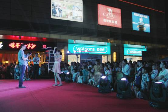 8月2日下午,虽然天气很炎热,但依然阻挡不了中环购物中心的人气,北广场人声鼎沸,超大型的舞台已经搭建完毕,路演活动预热气氛,来逛商场的情侣们纷纷玩起了体验活动,赢取免费赠饮,等待着情侣闯关活动的正式举行。