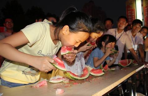 接下来成人组的比赛中,战况异常激烈,男生队队员们为确保能在最短的时间内吃完,各位精英壮汉纷纷使出浑身解数,拼命的将西瓜塞进嘴里。女生队更是令人刮目相看,优雅的形象早已抛诸脑后,这个时候,只有胜利才是最重要的事情。