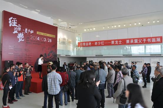 2014年3月28号下午3点,经霜益艳老少红——萧龙士、萧承震父子书画展在中环艺术馆隆重开幕,本次书画展由安徽省政府参事室、省文史研究馆、萧龙士艺术研究会以及中环艺术馆联合主办。展出百岁画家萧龙士在不同阶段的60余幅精品之作及萧承震40余幅佳作。以及萧龙士家族的老照片、画案上曾伴随萧龙士作画的笔墨纸砚以及教诲后辈的信笺等物品。原省政协副主席杜诚,省政府参事室党组书记、主任周庆,中央文史馆书画院安徽分院院长、省政协常委、省政协人口资源环境委员会副主任邱江辉,省政府办公厅副巡视员、省文史馆副馆长余家林,省美协主席张松,省美协副主席王佛生,著名艺术评论家郭因,中环投资集团总裁助理黄少铭以及安徽艺术界的知名人士、各界朋友均出席了开幕式。