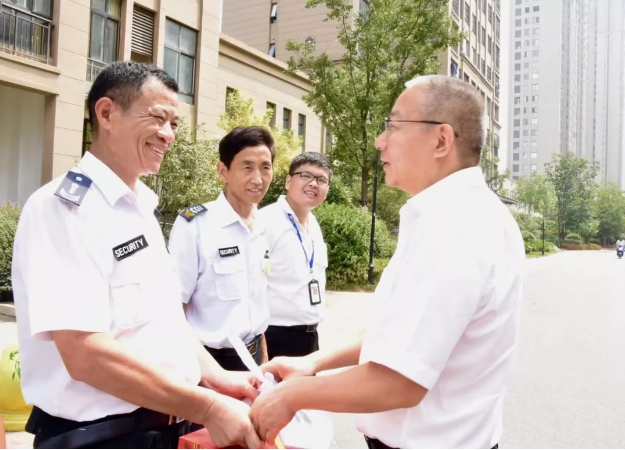 随后,乔总对各个管理小区进行了巡查,并对物业提出了指导性意见,提出要加大物业投入,更加重视硬件的升级改造,打造新一代物业管理与社区服务体系,为业主创造和谐美好的社区生活。最后,乔总、朱总及物业领导、工会领导一起为员工们送上防暑降温用品。