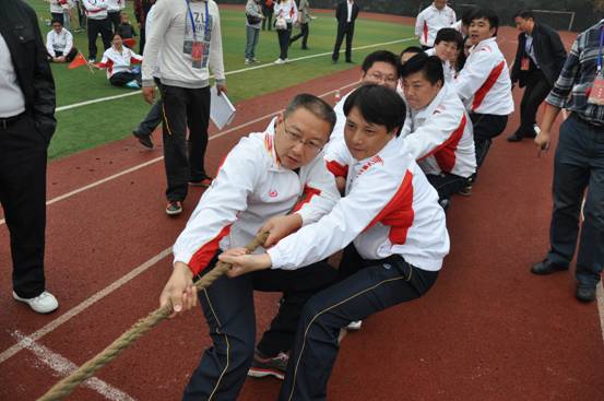 第一场是拔河比赛,是参与人数最多的一项比赛,技巧性不强,拼的就是一股气。董事长余竹云,执行总裁乔晓戈作为外援参加了综管文化系统的拔河队伍,第一场对经营管理系统,队员们摩拳擦掌,扎好马步,双手紧握着拔河绳,一鼓作气赢得胜利,成功进入第二轮比赛。第二场开始,面对人高马大的上海中云公司,行政人事中心总经理刘伟开玩笑说:“余总,你和乔总这一参加,这上海中云还敢赢吗?”余总拍拍手站起来笑着向对手上海中云公司队伍说:“我知道你们平时工作比较辛苦,很忙也很累,工作中也一定少不了受些委屈,平时估计也不敢说,今天就是你们出气的好机会,来吧!”哨声响起,余总、乔总和综合文化系统的队员一起大声的喊着口号:“一二、一二……”,上海中云公司队伍毫不让步,齐齐发力,鼓足了气,拼红了脸,最后赢得了比赛。