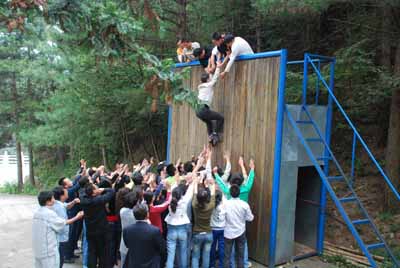 在短短一天的时间里,全体队员进行了信任背摔、空中飞人、梅花朵朵开、穿越沼泽、冲上云霄、毕业墙、穿越大峡谷等项目。在训练中,五个小分队都以自己特色的队名、响亮的口号互相鼓励、团结协作,努力完成每一个项目,训练场上处处可以看到相互搀扶、互相鼓劲的动人场面。队员们打破固有的思维定势,发展创造性思维,使大家的主动性、责任感以及团队意识都得到了充分的展示和升华。