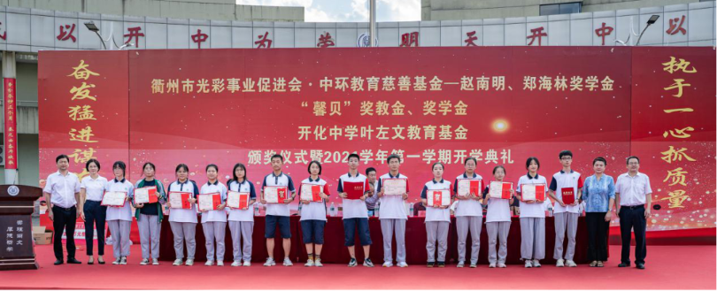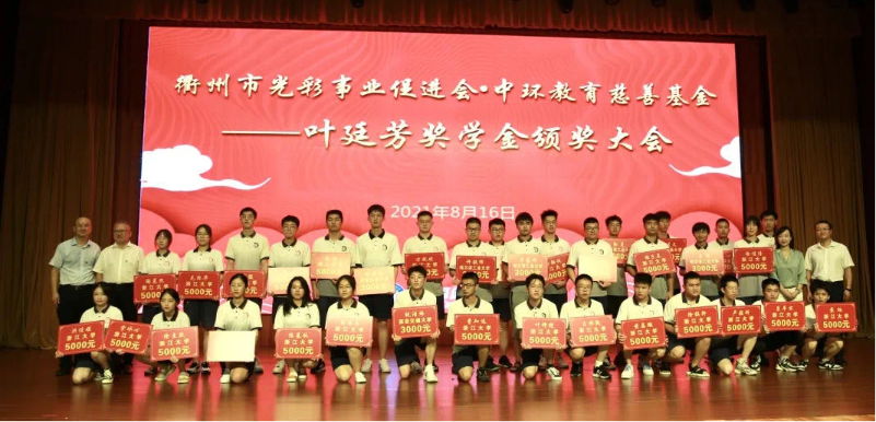 助力共同富裕,书写桑梓情怀。在第37个教师节来临之际,“衢州市光彩事业促进会·中环教育慈善基金”2021年度奖学金颁发仪式分别在衢州一中、江山中学、龙游中学、衢州高级中学、衢州中专、开化中学、衢州二中、衢州三中、常山一中、江山实验中学十所学校隆重举行。本年度获奖学生共921人,其中被清华大学、北京大学、中国科学院大学等双一流大学或双一流专业录取的学生达400人,奖学金总额达200万元。