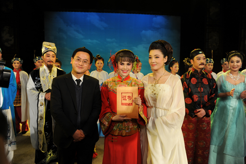 演出结束后,中环投资集团总裁助理黄少铭先生登台为韩再芬的洋徒弟白莉颁发证书,并与韩再芬以及再芬黄梅艺术剧院的演员们集体合影留恋。