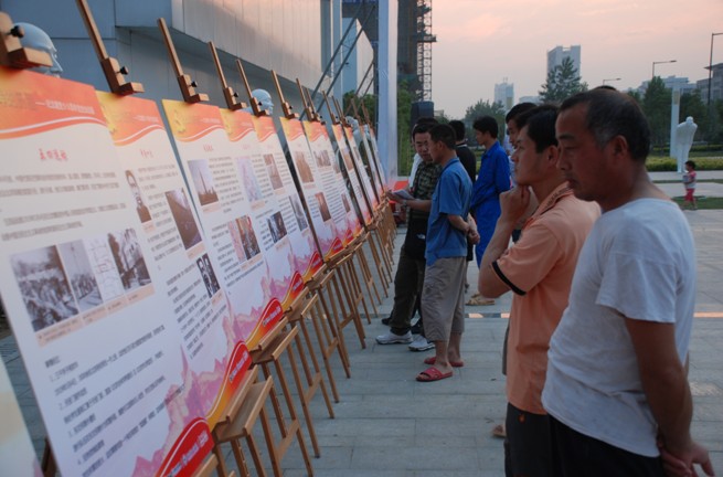 38岁的农民工李松华刚刚吃完饭,脸颊上泛着红光,站在展板前喃喃自语:“我们六安可是老区呀,一个金寨县就出了那么多将军。”看到记者在场,他笑眯眯地说,别看我们是大老粗,可照样关心国家大事呀。