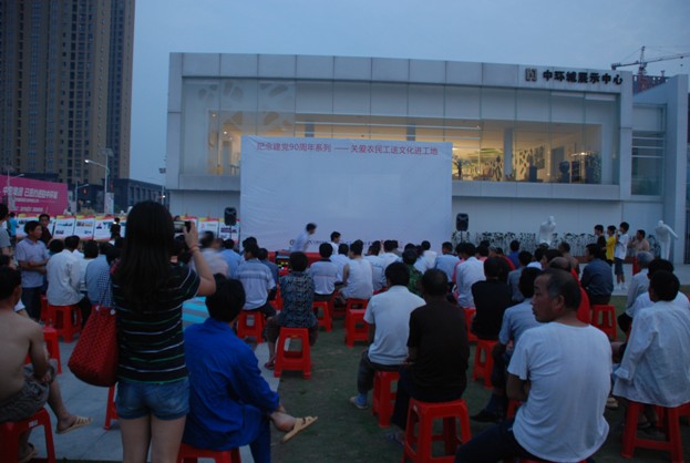 晚7时,晚霞烧红了西边的天空,月亮悄悄爬过刚刚封顶的高楼,塔吊巨大的手臂横在半空中。在月亮之下,钢筋水泥之中,中环城艺术馆门前搭起了舞台行架,白色的银幕上印着“纪念建党90周年——安徽中环投资集团关爱农民工送电影进工地”。该活动由安徽大学电子信息工程学院和安徽中环集团联合举办,今年已是第二届。