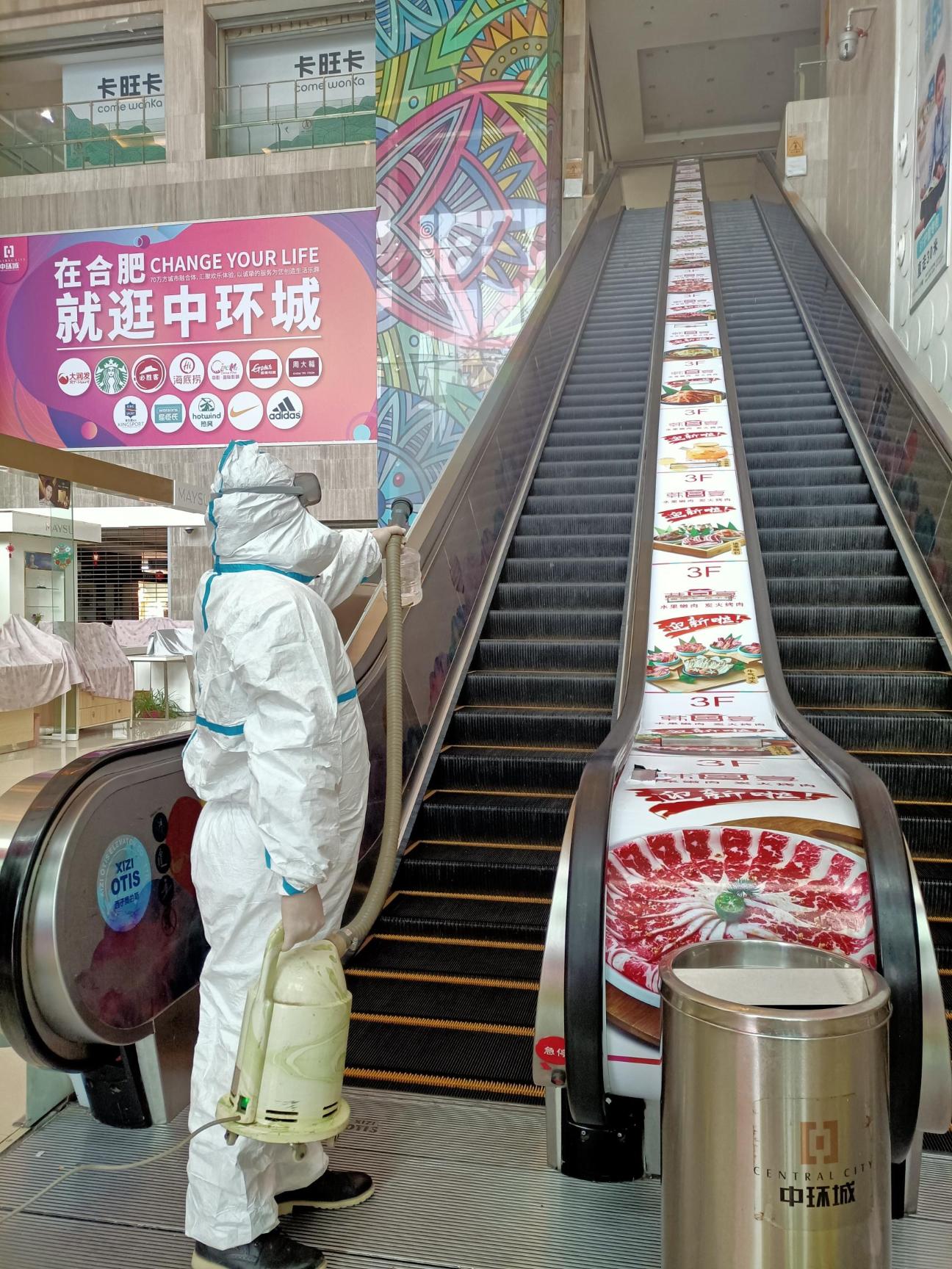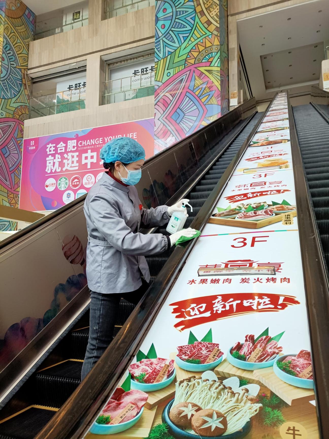 图丨中环工作人员对商场扶梯进行全方位消杀