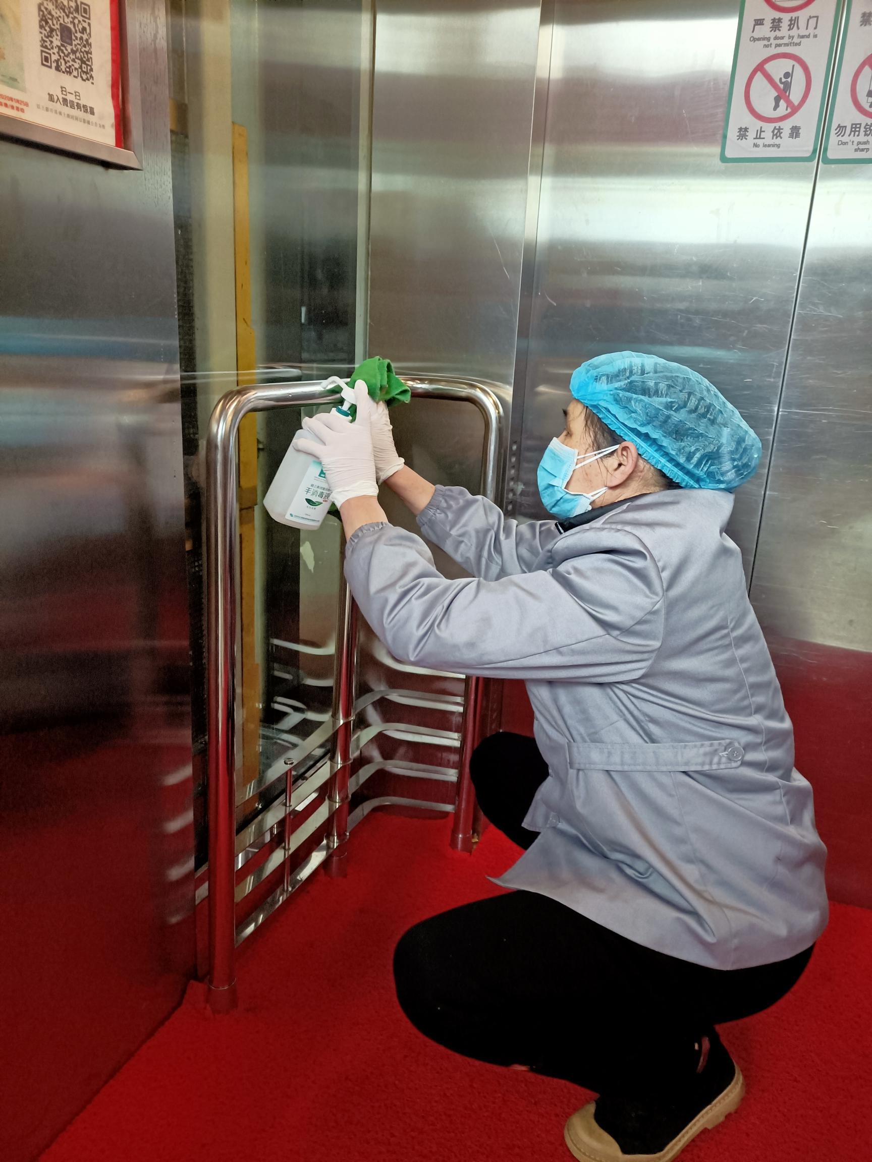 图丨中环工作人员对电梯进行消杀