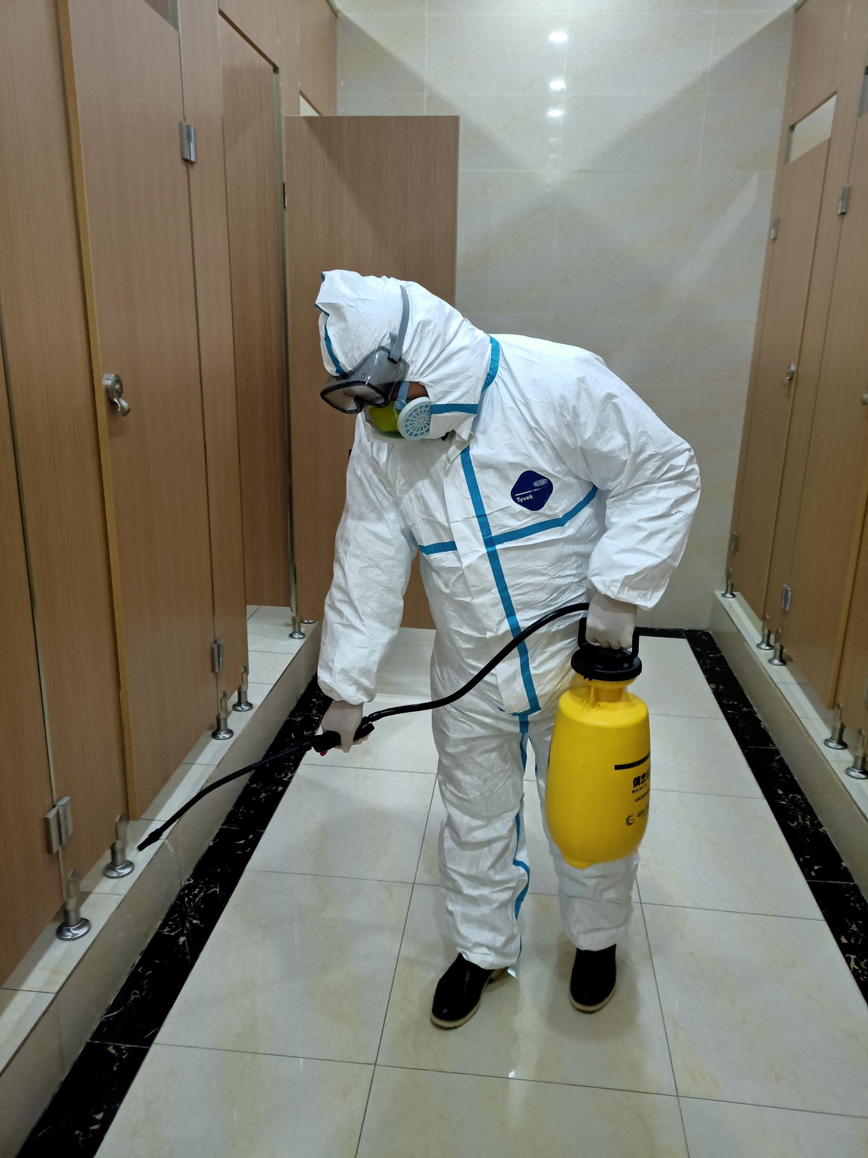 图丨中环工作人员在卫生间喷洒消毒液