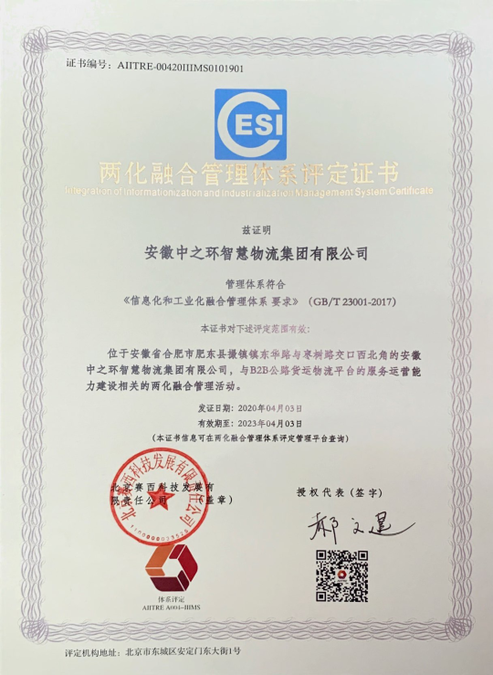 2020年4月3日,安徽中之环智慧物流集团有限公司顺利通过国家工业和信息化部《信息化和工业化融合管理体系要求》(GB/T23001-2017)体系认证,获得“两化融合管理体系评定证书”,标志着公司在推进“信息化和工业化”深度融合方面进入了一个新的阶段。