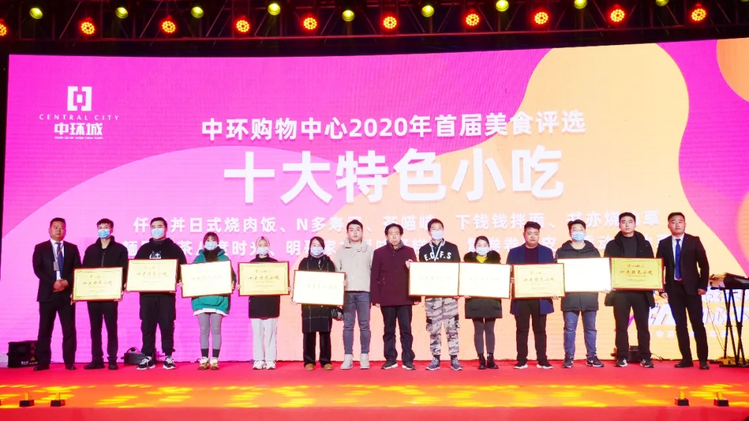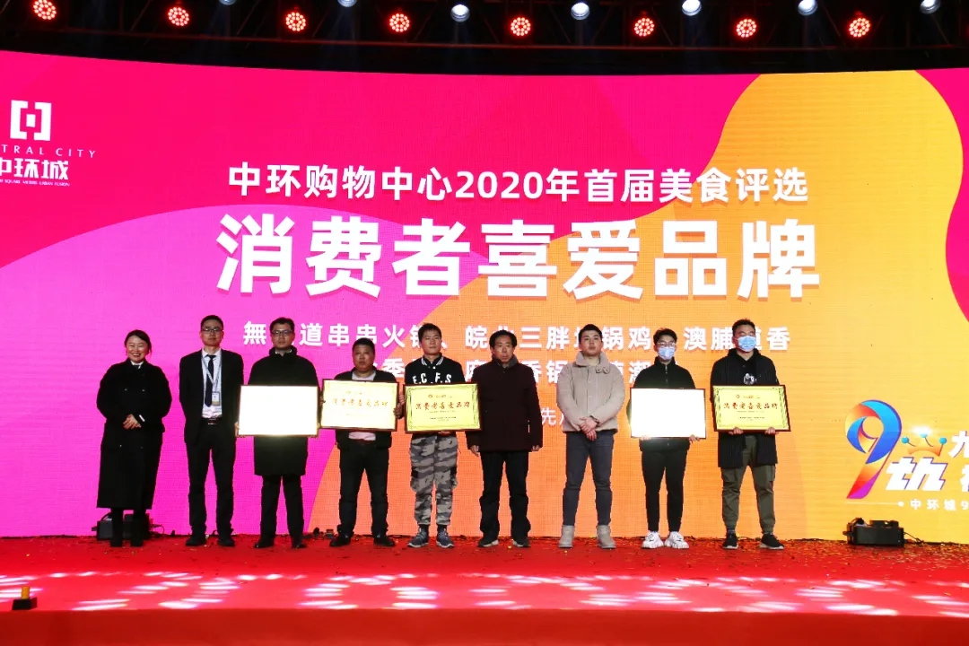 2020年,中环购物中心还在全省权威机构主办、安徽省餐饮行业协会承办的“更具人气美食广场”“更具影响力餐饮消费中心”评选活动中荣获双牌荣誉,其中“更具影响力餐饮消费中心”评选项目更是荣登榜首,这既是行业对中环购物中心的肯定,也是广大消费者对中环购物中心的极大认可。这一切离不开所有合作伙伴的戮力同心,更离不开合作方、品牌方以及商户们的鼎力支持。在11月份商管公司自主举办的“乐享美味 吃在中环”线上评选线下试吃活动中,中环城餐饮商户积极参与。9周年庆典仪式上,商管公司总经理张雪亮、商管公司副总经理赵晖、安徽省餐饮行业协会常务副会长佘林明、万家热线助理总经理庄梁军及商管公司管理团队为餐饮美食优秀商户颁发荣誉奖牌。
