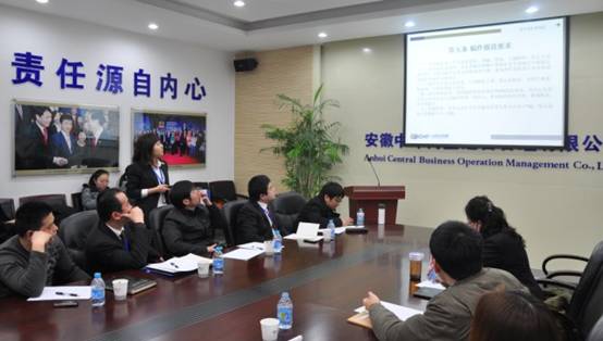 “年终集团组织问卷调查测评员工对企业文化认同度要求达到80%以上”。培训开始,中环投资集团总裁助理黄少铭从企业文化、公关关系、客户服务三个业务模块,阐述了2012年集团公司对各中心、项目公司的宣传工作综合管理评估标准。