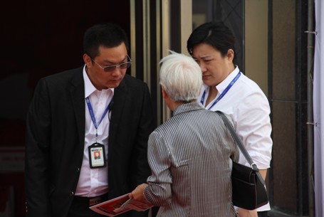 在交房现场,陈总悉心为一位业主老太太解决问题。